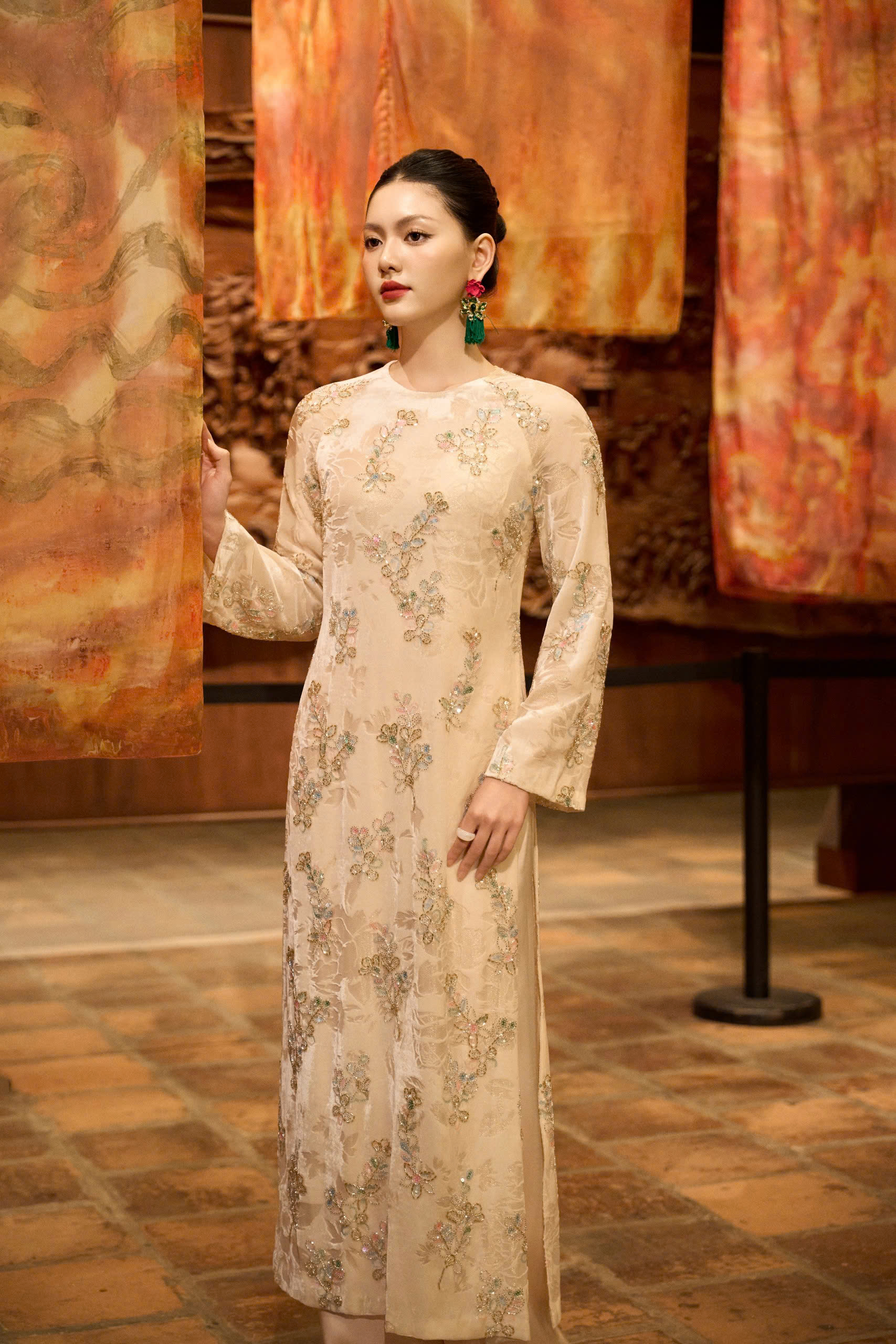 chất liệu : Nhung hoa 3D / thêu tay đính cườm, pha lê thủ công