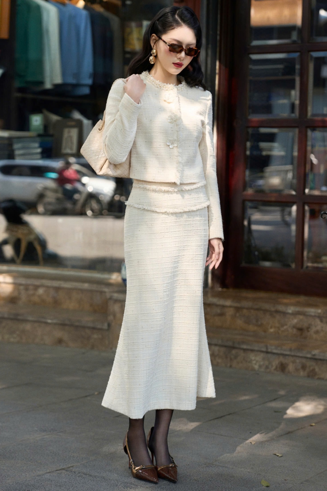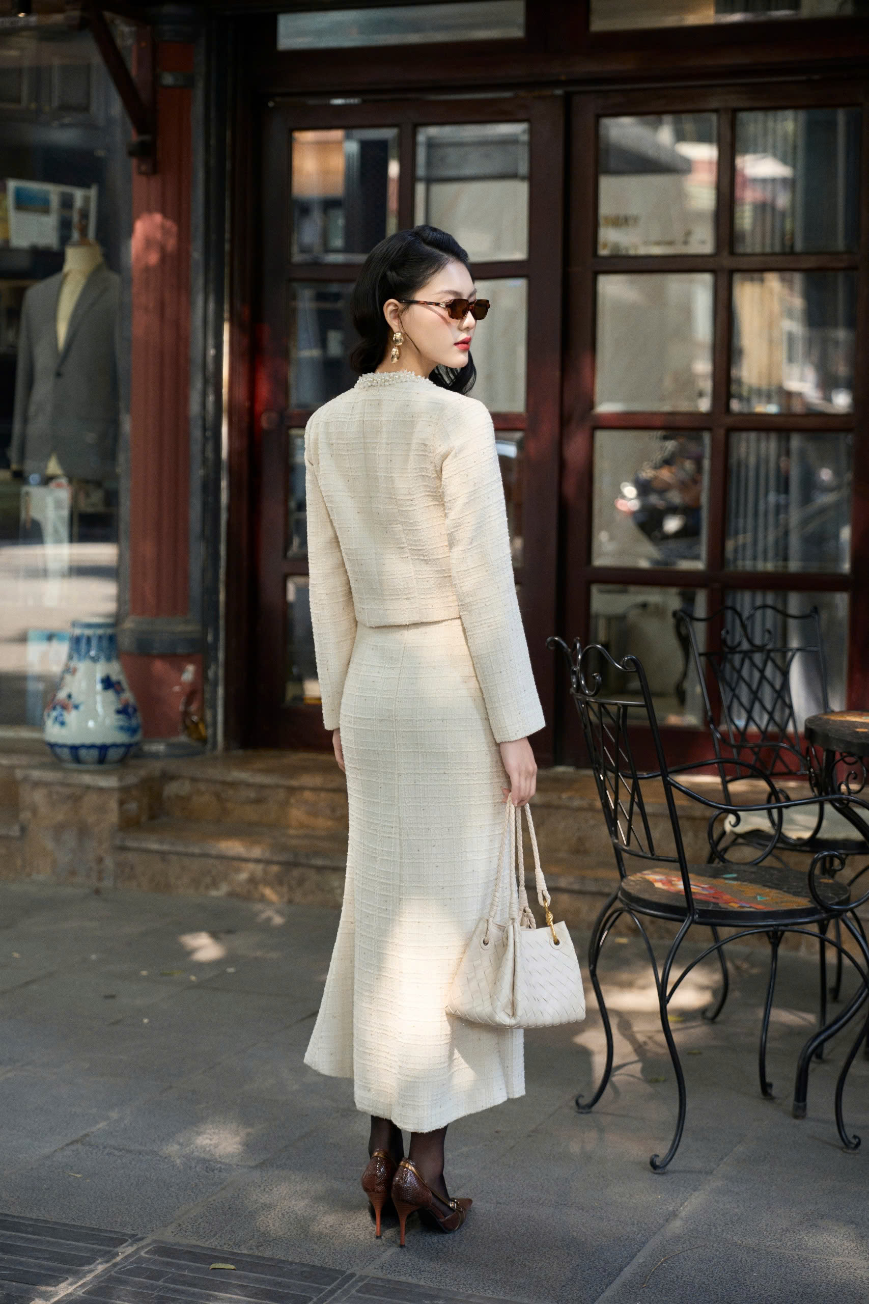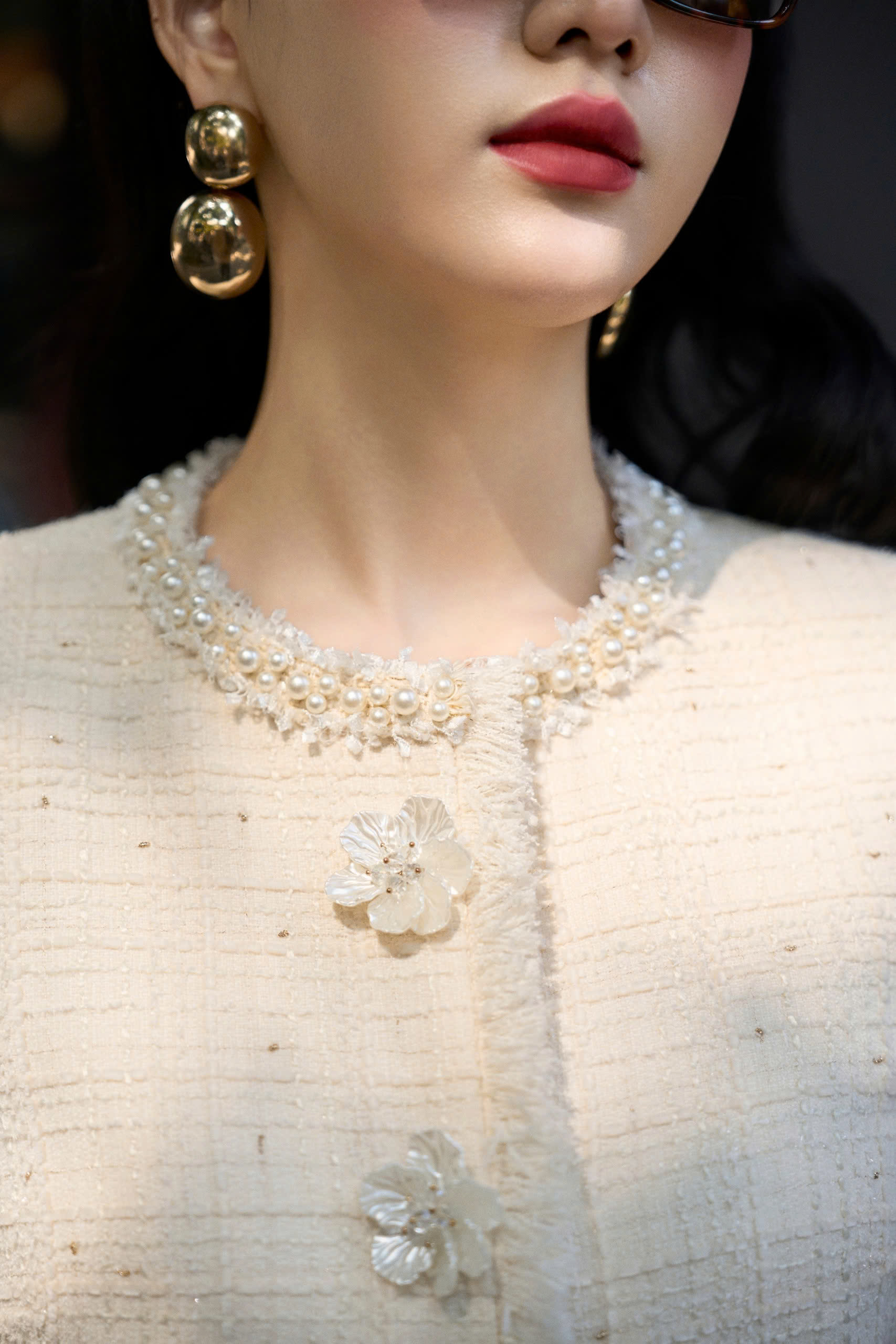 - Description: A round-neck tweed jacket embellished with pearl details. The button line features delicate handcrafted floral buttons, finished with fringed trims. Paired with a straight-cut fishtail skirt.