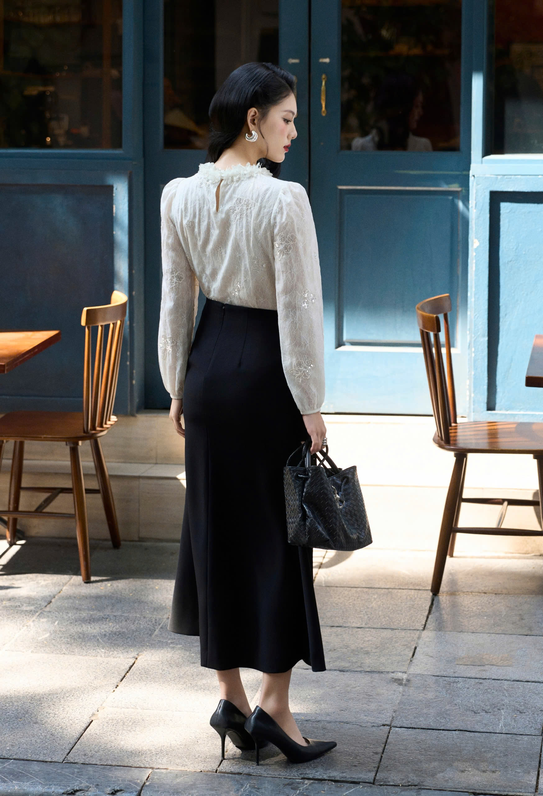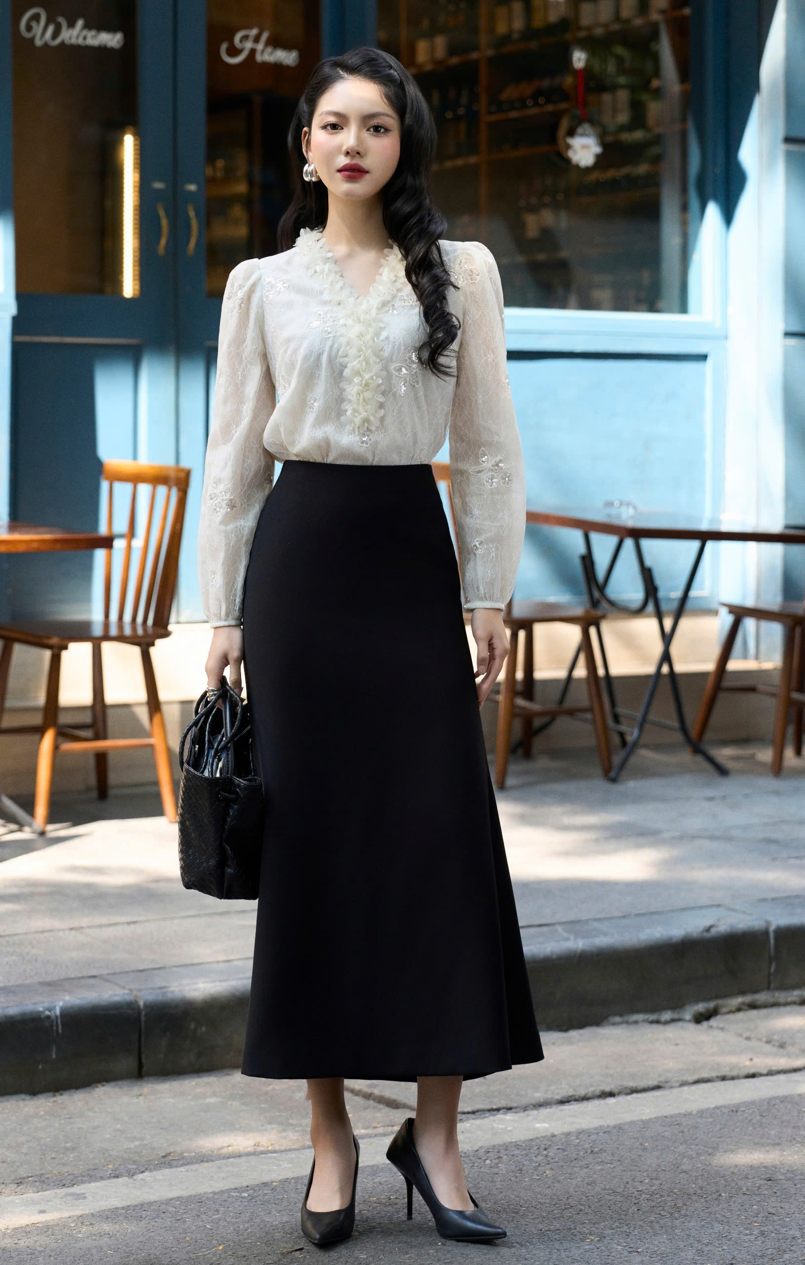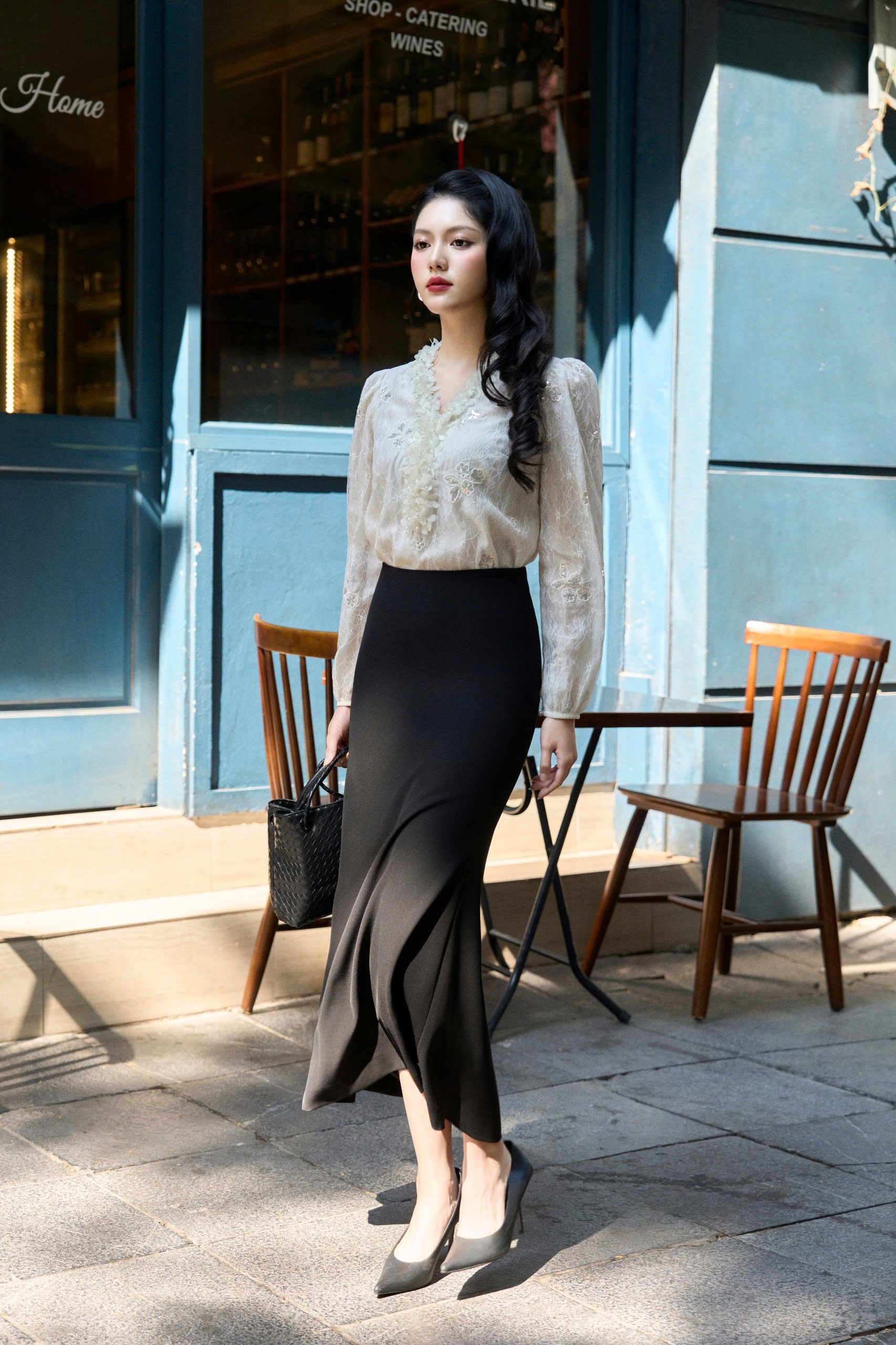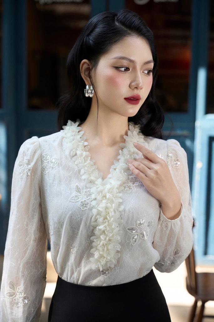 Mô tả : áo tay dài, dáng suông. Phần cổ V được đính hoa thủ công
