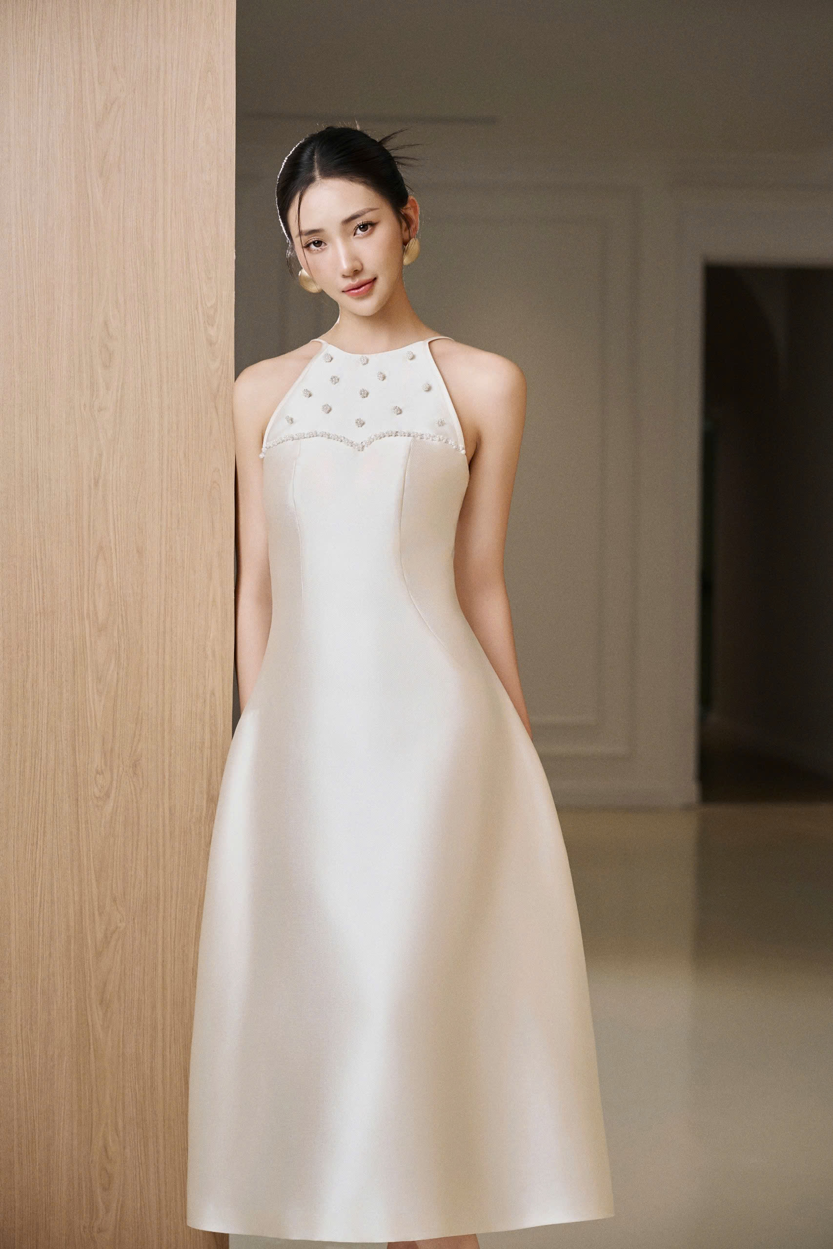 Mô tả : Đầm yến chất liệu taffeta đính charm thủ công , vừa vặn cơ thể, dây kéo khoá phía sau