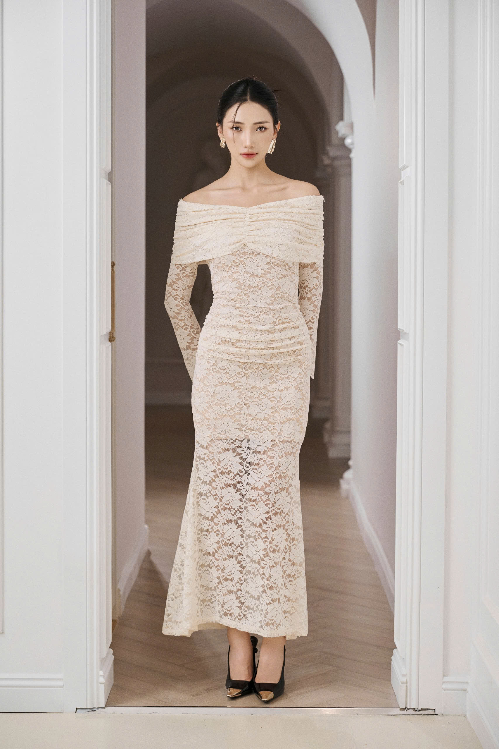 - Mô tả : Đầm ren đuôi cá, phần vai biến tấu mặc được nhiều phong cách khác nhau, chất liệu co dãn thoải mái