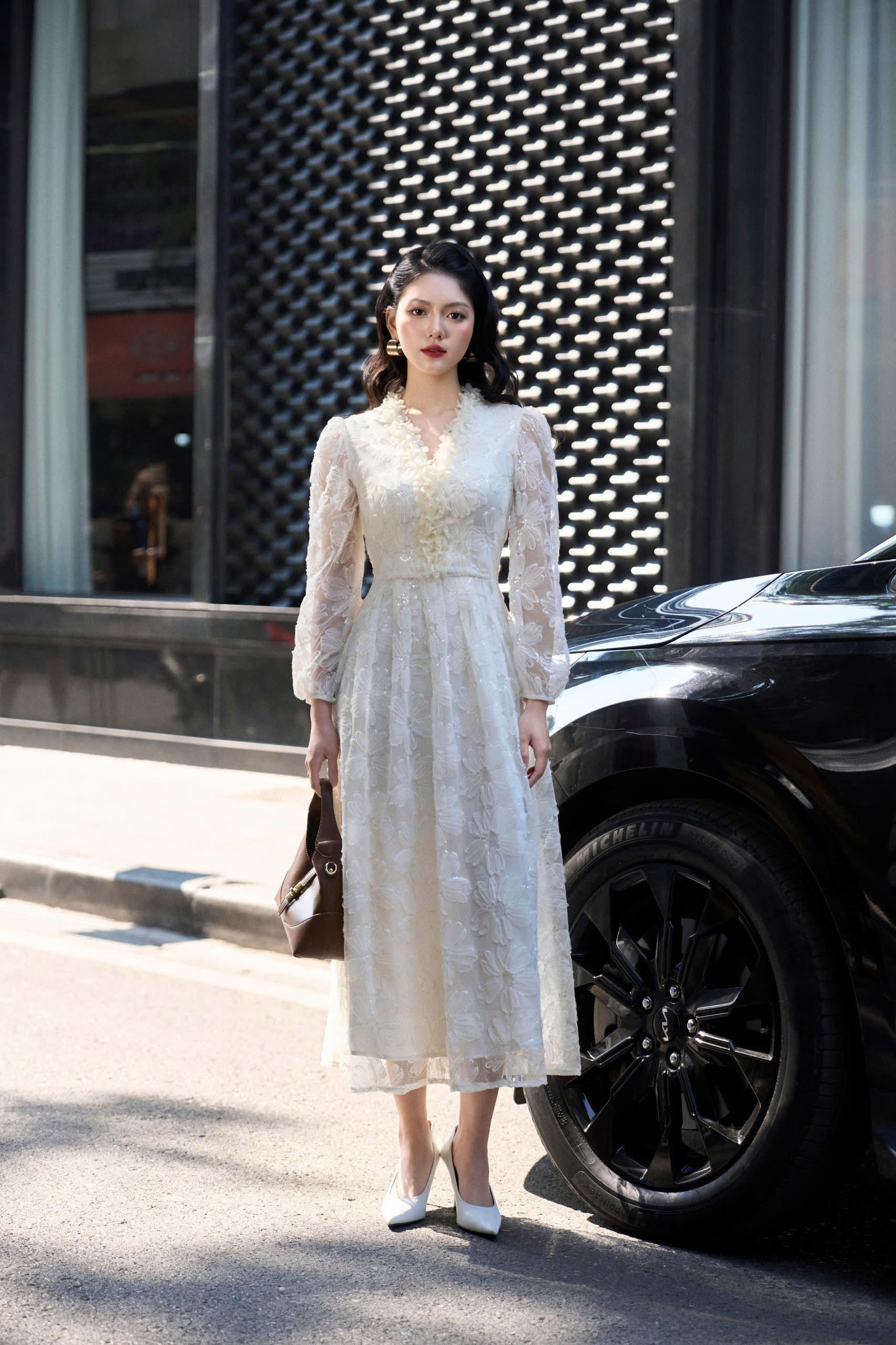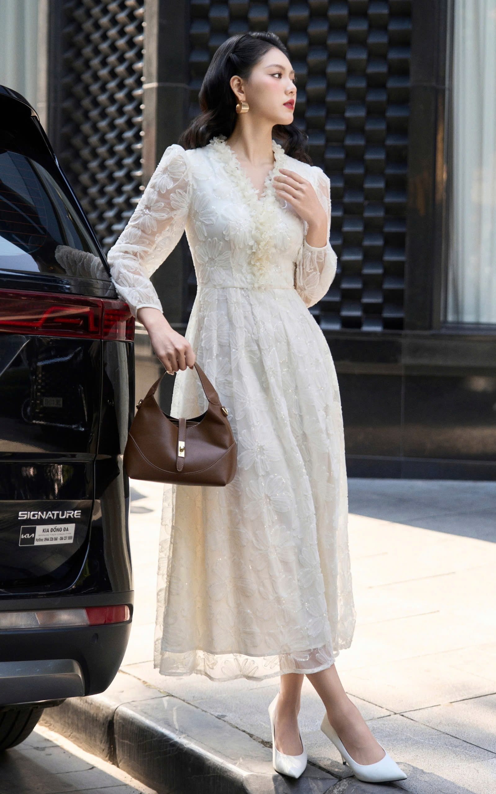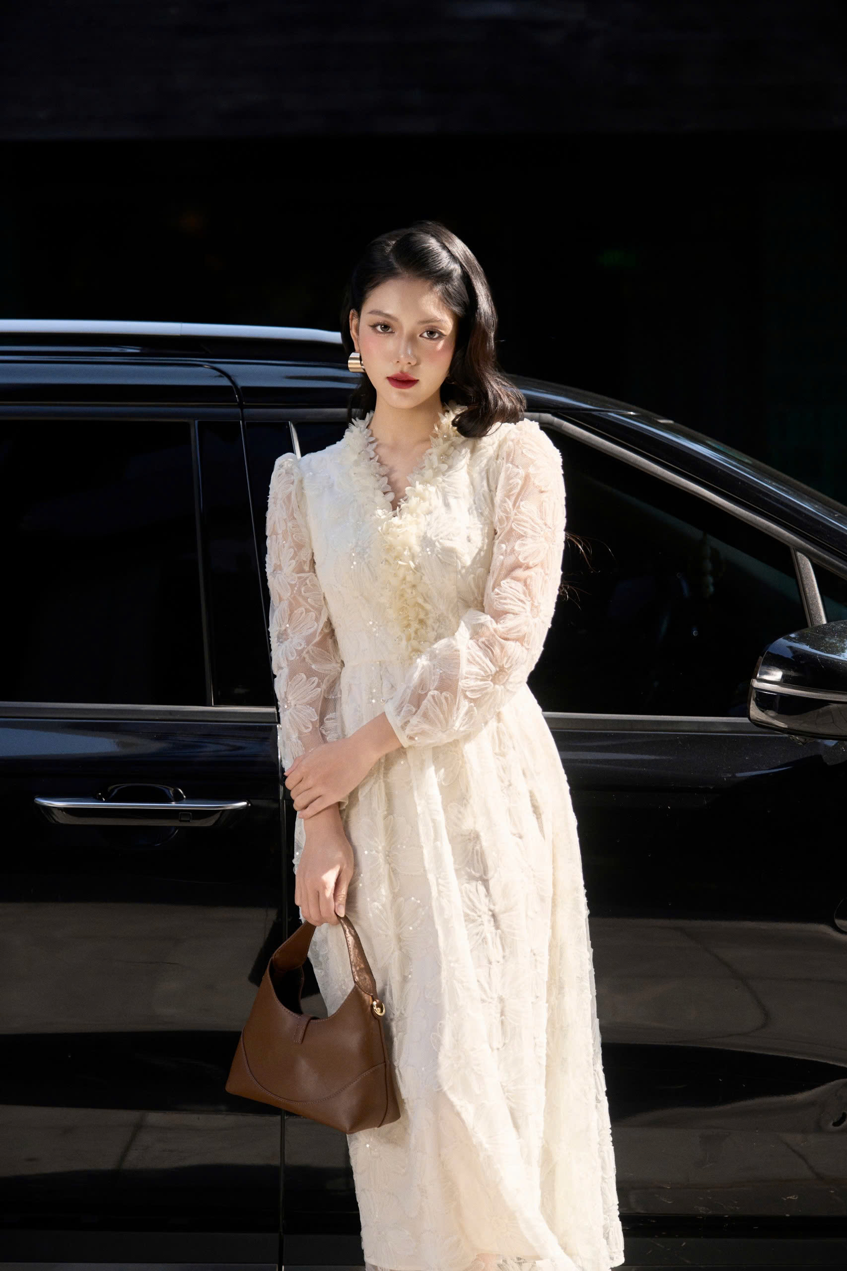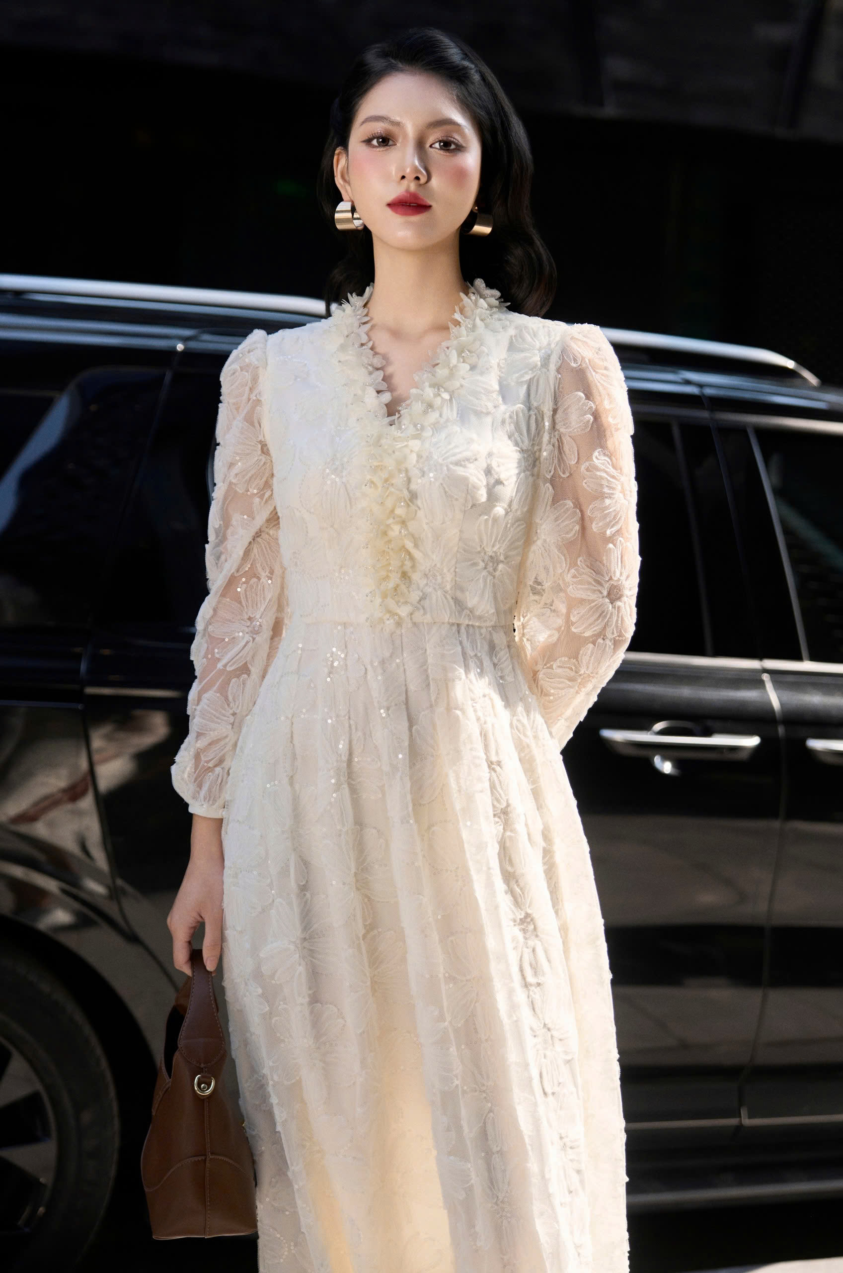 Mô tả : đầm ren thêu 3D . Phần cổ V được đính hoa viền cổ đính hoa thủ công . Gấu váy xoè rộng.